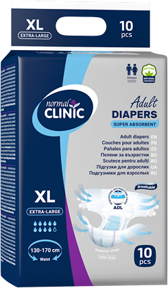 Дишащите универсални пелени за възрастни normal CLINIC са ефективно решение за контрол на инконтиненцията. Пелените за възрастни normal CLINIC Extra-large са предназначени за употреба при тежки степени на уринарна и фекална инконтиненция. Гарантират бързо усвояване на течността, благодарение на висококачествен суперабсорбент, а системата за неутрализиране на неприятните миризми осигурява максимален комфорт. Добавените защитни бордовете от вътрешната страна, надеждно предпазват от протичане, не протриват и не оставят следи по кожата. Широките и еластични закопчалки тип велкро са предназначени за сигурно многократно фиксиране, а меките и дишащи материали са приятни на допир и не дразнят кожата. Пелените имат и индикатор за намокряне – синя лента, чието изчезване показва необходимостта от смяна на пелената.
