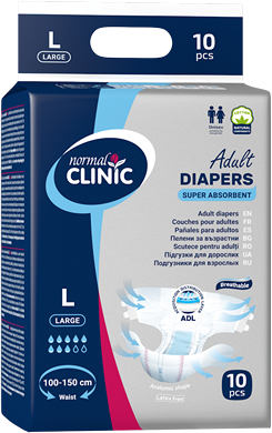 Дишащите универсални пелени за възрастни normal CLINIC са ефективно решение за контрол на инконтиненцията. Пелените за възрастни normal CLINIC Large са предназначени за употреба при умерена до тежка уринарна и фекална инконтиненция.Гарантират бързо усвояване на течността, благодарение на висококачествен суперабсорбент, а системата за неутрализиране на неприятните миризми осигурява максимален комфорт. Добавените защитни бордовете от вътрешната страна, надеждно предпазват от протичане, не протриват и не оставят следи по кожата. Широките и еластични закопчалки тип велкро са предназначени за сигурно многократно фиксиране, а меките и дишащи материали са приятни на допир и не дразнят кожата. Пелените имат и индикатор за намокряне – синя лента, чието изчезване показва необходимостта от смяна на пелената.