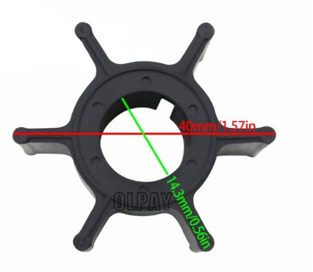 Работно колело на водна помпа за Yamaha 6A (сериен номер 00601 и нагоре за двигатели с къс вал и 30301 и нагоре за модели с дълъг вал), 6B, 8A (сериен номер 20161 и нагоре за двигатели с къс вал и 54716 и нагоре за модели с дълъг вал), 8B & 15A 2-тактови извънбордови модели.