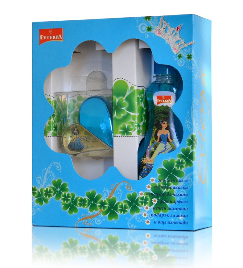 Комплектът съдържа деликатен парфюм във формата на сърце (23мл), нежен шампоан (170мл), чудна приказка, забавен пъзел и подарък за мама.
