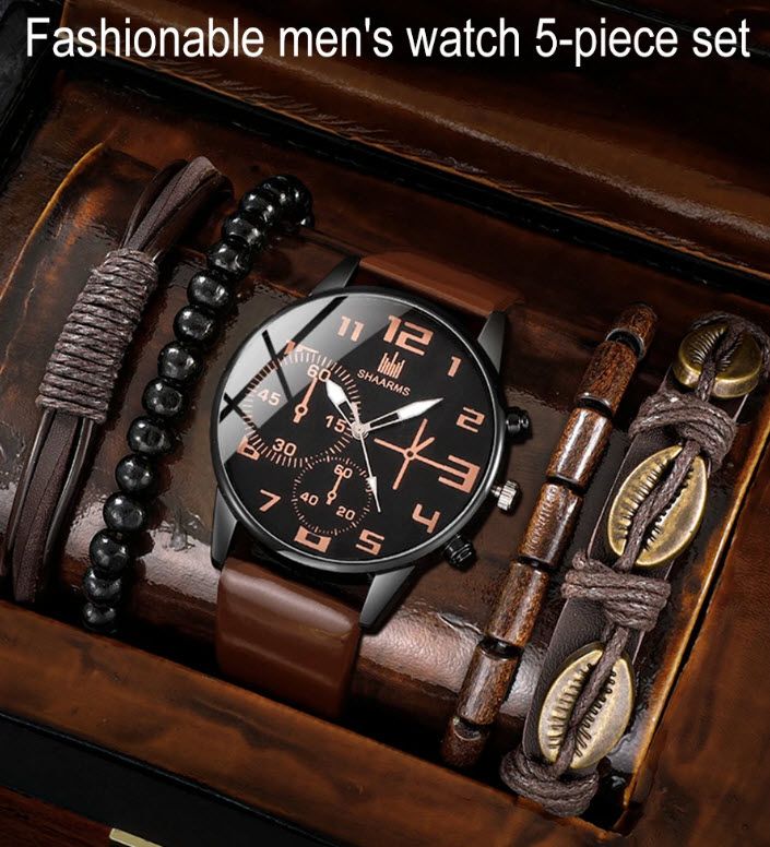 Комплект от 5 части 1 кръгъл мъжки кварцов часовник и 1 гривна 1 колие, идеален избор за подаръци