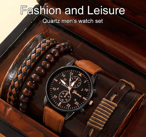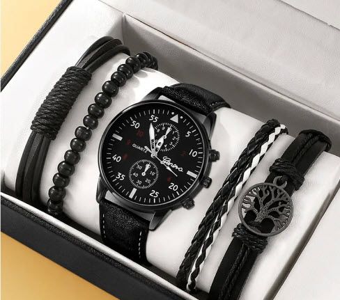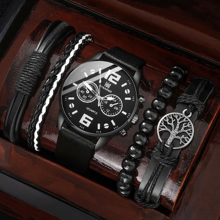 Начало ЧАСОВНИЦИ И БИЖУТА Комплект от 5 части 1 кръгъл мъжки кварцов часовник и 1 гривна 1 колие, идеален избор за подаръци