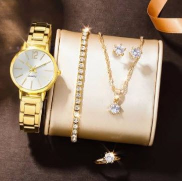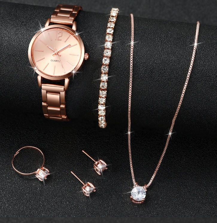 Комплект от 6 части. Дамски Часовник Елегантен Кварцов Часовник С Цветя Блестящ Аналогов Ръчен Часовник И Комплект Бижута С Кристали,Супер Подарък
